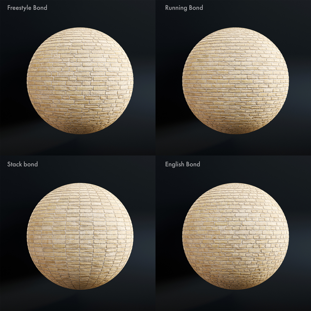 Each seamless PBR Brick texture comes in two distinct sizes: 2.5 meters and 5 meters in width. The 2.5-meter texture offers greater detail, perfect for close-ups, while the 5-meter texture minimizes repetition, making it ideal for large facades. Each texture comes with 4 different bond styles. Running, freestyle, english and stacked bond.