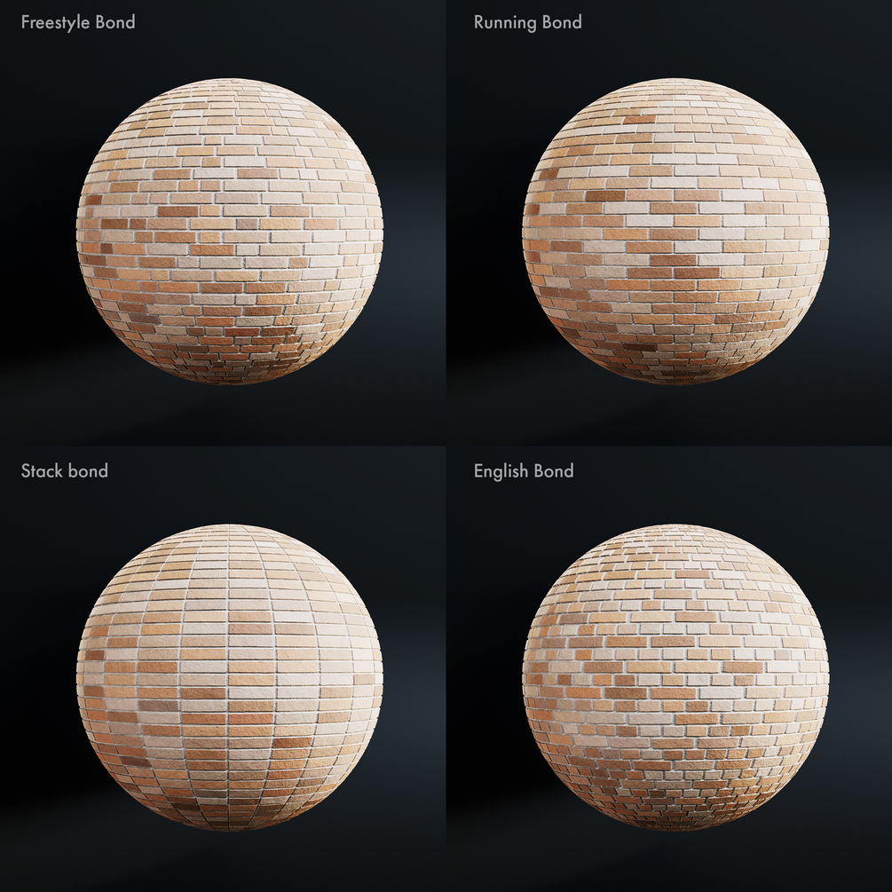Each seamless PBR Brick texture comes in two distinct sizes: 2.5 meters and 5 meters in width. The 2.5-meter texture offers greater detail, perfect for close-ups, while the 5-meter texture minimizes repetition, making it ideal for large facades. Each texture comes with 4 different bond styles. Running, freestyle, english and stacked bond.