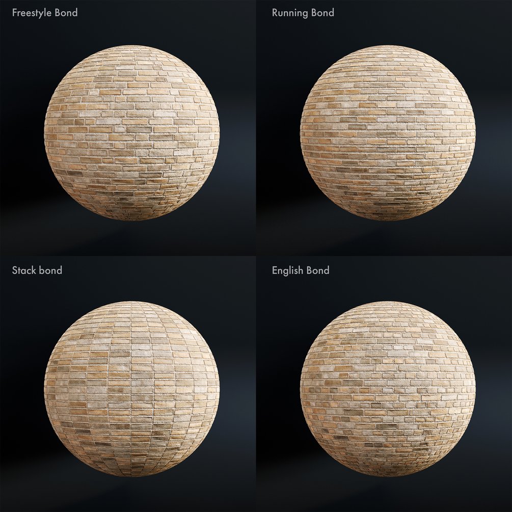 Each seamless PBR Brick texture comes in two distinct sizes: 2.5 meters and 5 meters in width. The 2.5-meter texture offers greater detail, perfect for close-ups, while the 5-meter texture minimizes repetition, making it ideal for large facades. Each texture comes with 4 different bond styles. Running, freestyle, english and stacked bond.