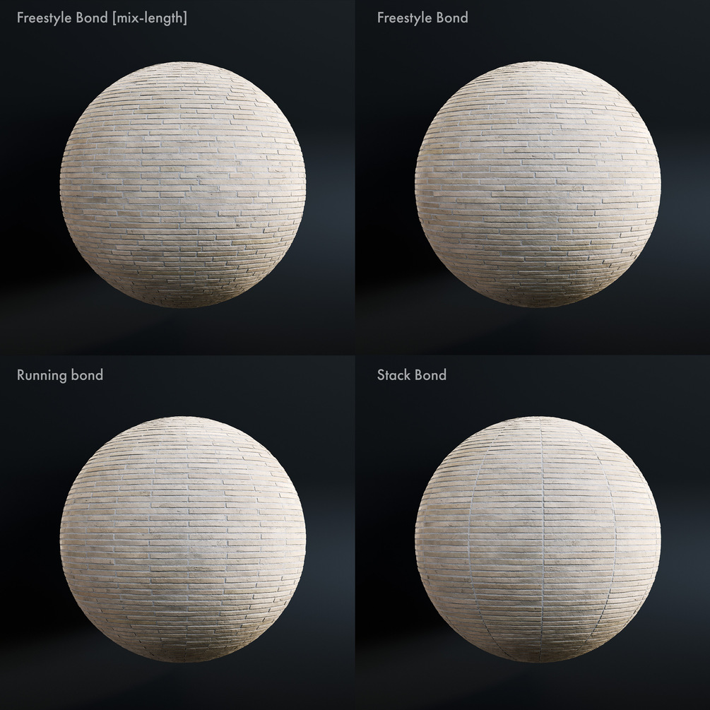 Each seamless PBR Brick texture comes in two distinct sizes: 2.5 meters and 5 meters in width. The 2.5-meter texture offers greater detail, perfect for close-ups, while the 5-meter texture minimizes repetition, making it ideal for large facades. Each texture comes with 4 different bond styles. Running, freestyle, english and stacked bond.