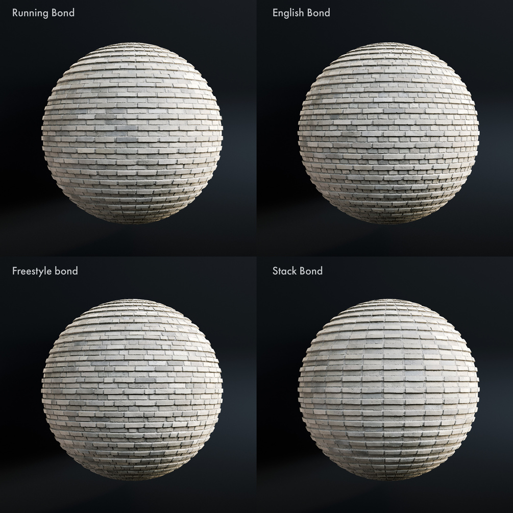 Each seamless PBR Brick texture comes in two distinct sizes: 2.5 meters and 5 meters in width. The 2.5-meter texture offers greater detail, perfect for close-ups, while the 5-meter texture minimizes repetition, making it ideal for large facades. Each texture comes with 4 different bond styles. Running, freestyle, english and stacked bond.